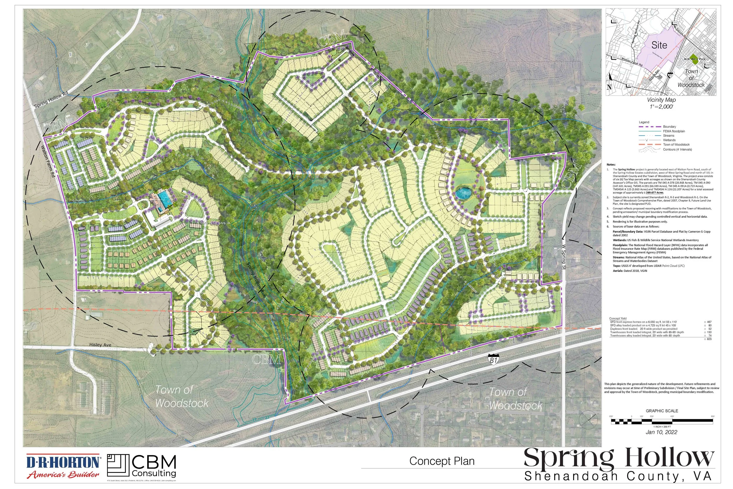 Spring Hollow, located in the town of Woodstock in the county seat of Shenandoah County, Virginia, is steeped in Revolutionary and Civil War history and natural beauty. The project was thoughtfully planned to harmonize with the natural beauty, history, and ecological character of its surroundings while introducing a community that feels timeless and connected. The design organizes the neighborhood into welcoming enclaves nestled among the property’s rolling meadows and mature woodlands. Homes are carefully sited to preserve open vistas and employ compact lot layouts, allowing expansive greenways, woodlands, and natural corridors to remain the focal point of the landscape.